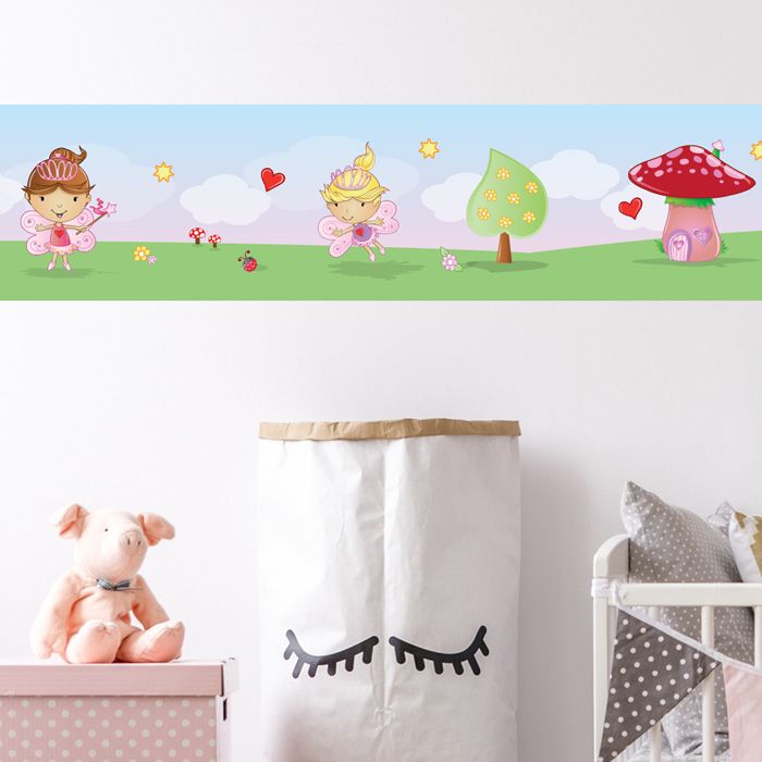 Mit dieser Bordüre kannst Du das Kinderzimmer in eine wunderschöne Feen-Welt verwandeln. Neben Feen, Drachen, Schmetterlingen und Marienkäfern, die entlang der Bordüre krabbeln gibt es auch verzauberte Pilze, die das Zuhause der Feen sind. Viele schöne Blumen und Zauberbäume schmücken die Bordüre. Hierzu gibt es sogar das passende Wandsticker-Set in verschiedenen Größen, so dass das gesamte Kinderzimmer geschmückt werden kann.