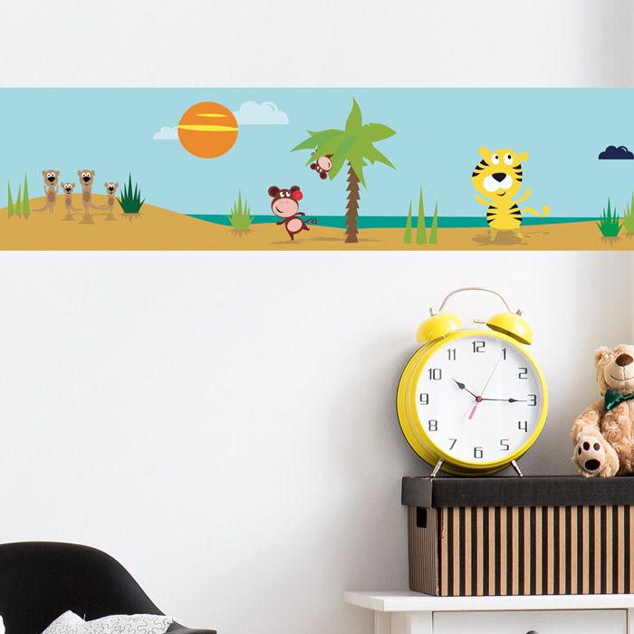 Hol Dir mit der Safari Bordüre die pure Wildnis ins Kinderzimmer. Lasst Euch von Löwen, Zebras, Giraffen, Nilpferden und Co begeistern. Neben den Tieren gibt es eine wunderschöne Wüstenlandschaft mit vielen Gräsern, Sträuchern, Gewässern und Palmen. Die süßen Erdmännchen halten die Stellung und das bald auch in Eurem Zimmer.