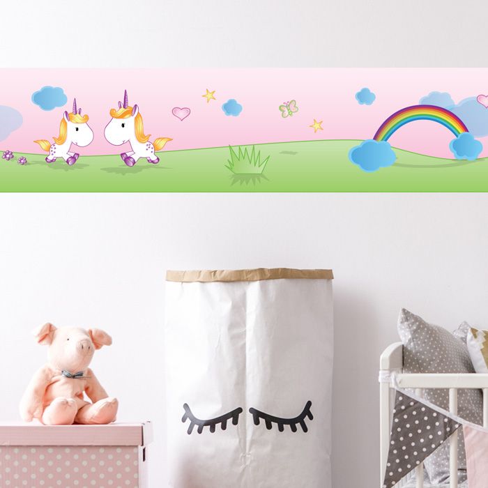 Diese tolle Bordüre passt perfekt in jedes Mädchenzimmer. Die Bordüre zeigt viele süße Einhörner in verschiedenen Farben, Regenbögen, Sterne und viele süße Herzen. Passend zu den Einhörnern ist die Bordüre in Rosa- und Pink-Tönen gestaltet worden. Lasst die süßen Einhörner an Eurer Kinderzimmerwand entlang galoppieren.