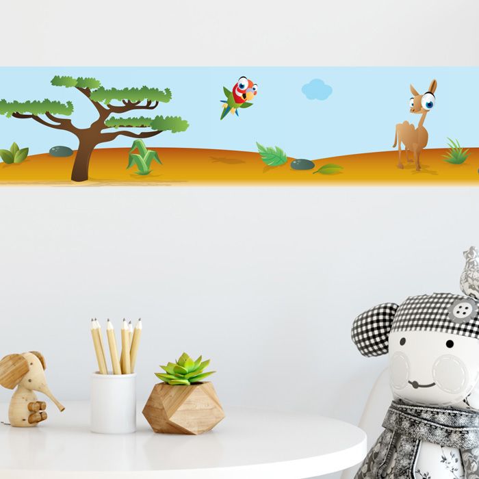 Eine Bordüre mit süßen Tieren aus Australien wie Kängurus, Exen, Koalas, Dromedaren und Papageien ist für jedes Kinderzimmer das absolute Highlight. Besonders die tollen und kräftigen Farben machen die Australien Bordüre zu einem tollen Highlight in Deinem Kinderzimmer. Im Hintergrund ist eine Wüste und eine Graslandschaft zu erkennen, auf der viele Pflanzen und Bäume wachsen.
