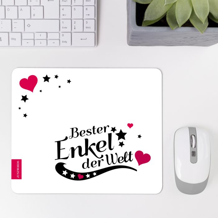 Mousepads mit außergewöhnlichen Motiven von JUNIWORDS. Dieses Mousepad zeigt den Spruch "Bester Enkel der Welt" umringt von Herzen und Sternen. Die Hintergrundfarbe dieses Mousepads ist weiß.