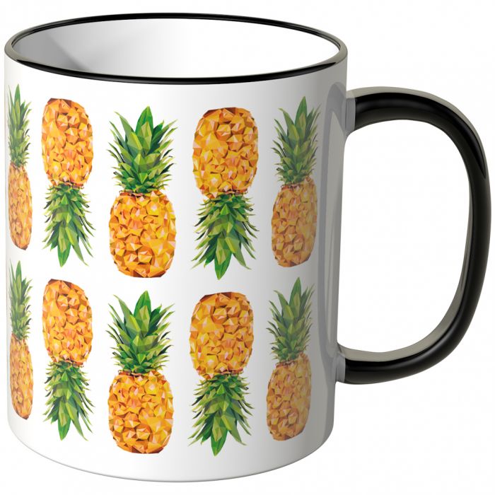 Diese Tasse wurde mit einer Vielzahl von leuchtend gelben Ananas bedruckt. Sie stehen abwechselnd richtig herum und auf dem Kopf.