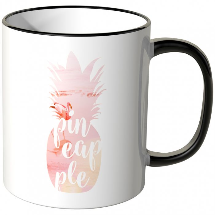 Auf dieser Tasse sieht man eine Ananas mit der Aufschrift "Pineapple" in weiß. In der Ananas sieht man einen Flamingo, der im Sand steht.
