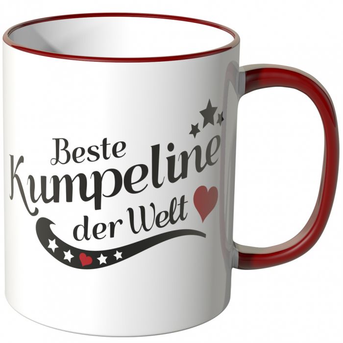 Diese Tasse wurde mit dem Spruch "Beste Kumpeline der Welt" in schwarz bedruckt. Daneben wurden Sterne und Herzen in schwarz und rot platziert.