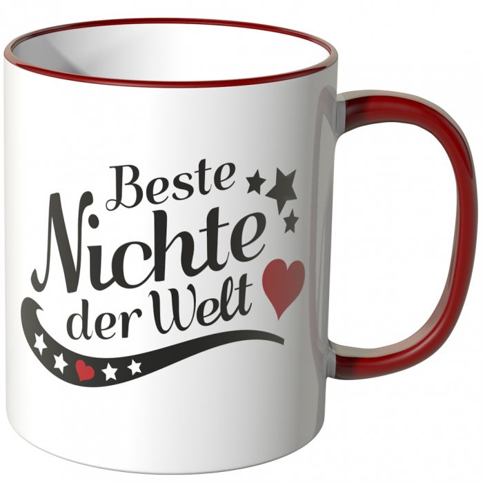 Diese Tasse wurde mit dem Spruch "Beste Nichte der Welt" in schwarz bedruckt. Daneben wurden Sterne und Herzen in schwarz und rot platziert.