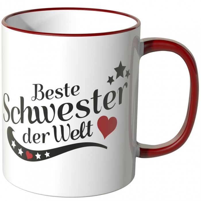 Diese Tasse wurde mit dem Spruch "Beste Schwester der Welt" in schwarz bedruckt. Daneben wurden Sterne und Herzen in schwarz und rot platziert.