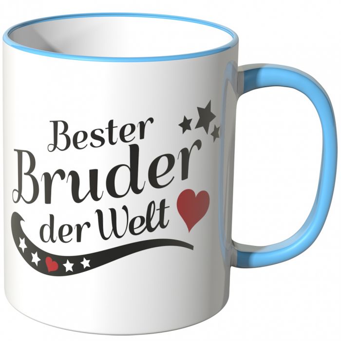 Diese Tasse wurde mit dem Spruch "Bester Bruder der Welt" in schwarz bedruckt. Daneben wurden Sterne und Herzen in schwarz und rot platziert.