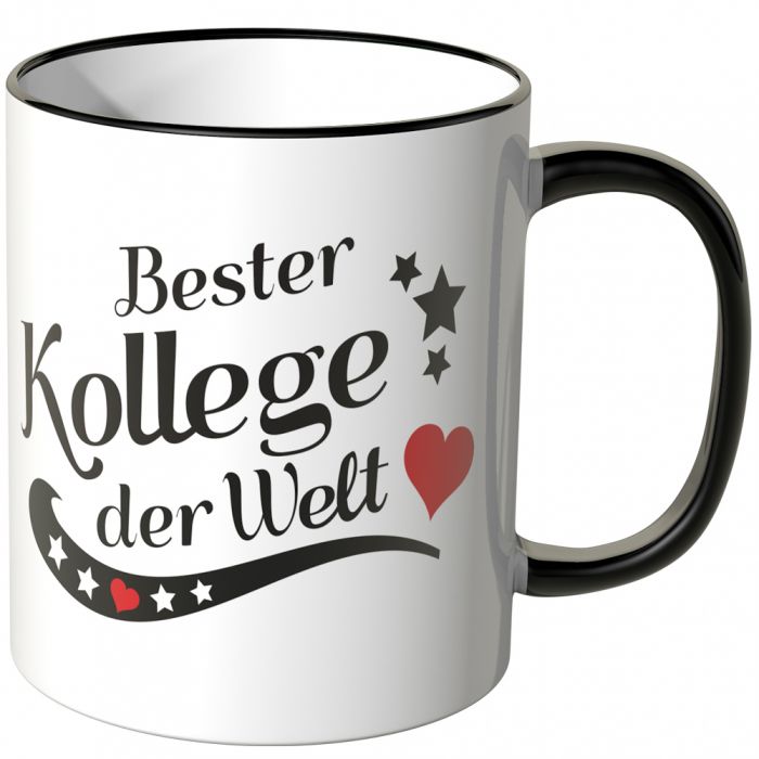 Diese Tasse wurde mit dem Spruch "Bester Kollege der Welt" in schwarz bedruckt. Daneben wurden Sterne und Herzen in schwarz und rot platziert.