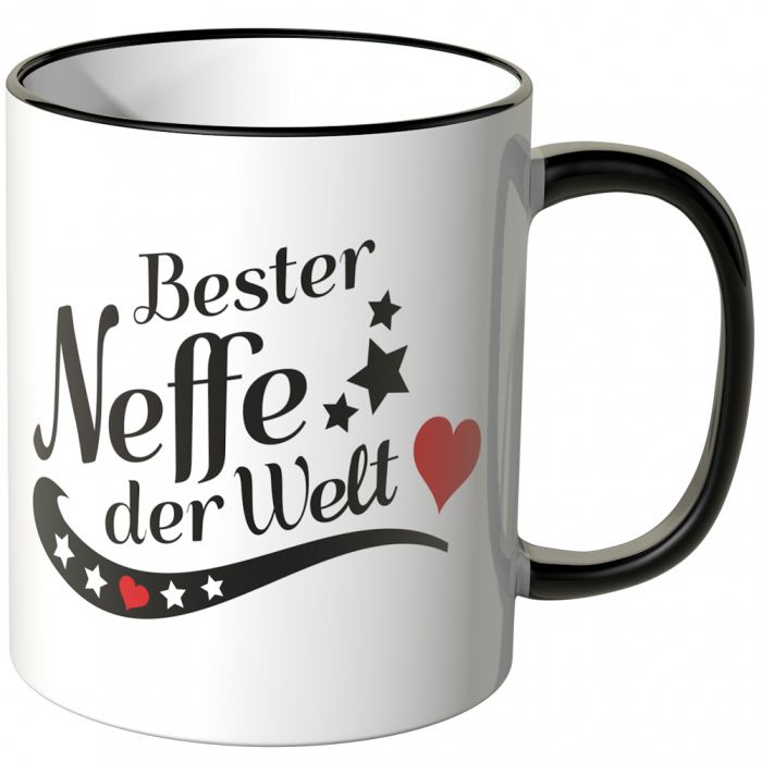 Diese Tasse wurde mit dem Spruch "Bester Neffe der Welt" in schwarz bedruckt. Daneben wurden Sterne und Herzen in schwarz und rot platziert.