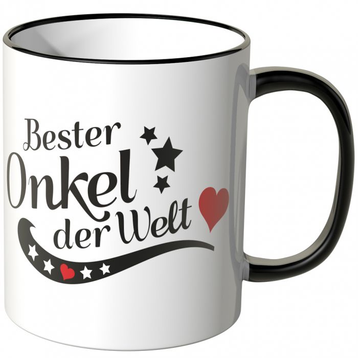 Diese Tasse wurde mit dem Spruch "Bester Onkel der Welt" in schwarz bedruckt. Daneben wurden Sterne und Herzen in schwarz und rot platziert.