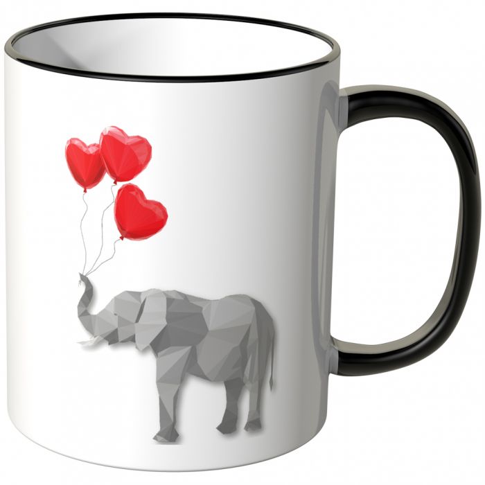 Auf dieser Tasse sieht man einen grauen, aus geometrischen Elementen bestehenden Elefanten, der mit seinem Rüssel drei rote Herzchenluftballons festhält.