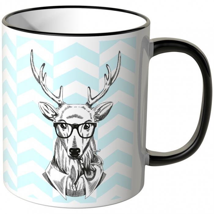 Diese Tasse ist mit einem Hirschkopf bedruckt, der eine Brille trägt und Pfeife raucht. Im Hintergrund verläuft ein hellblau-weißes Chevronmuster.