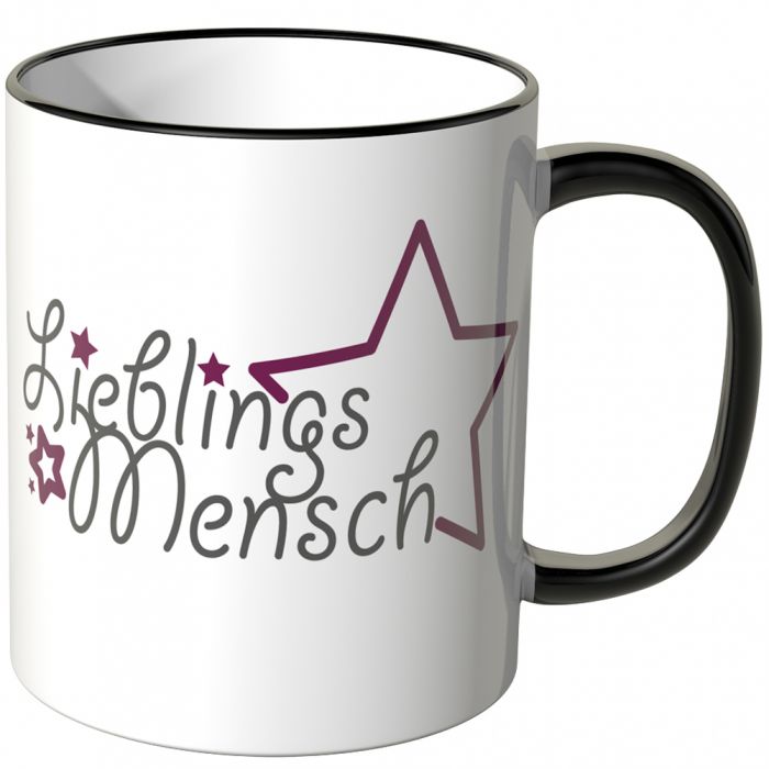 Diese Tasse wurde mit dem Wort "Lieblingsmensch" in schwarz bedruckt. Daneben wurden Sterne in lila platziert.
