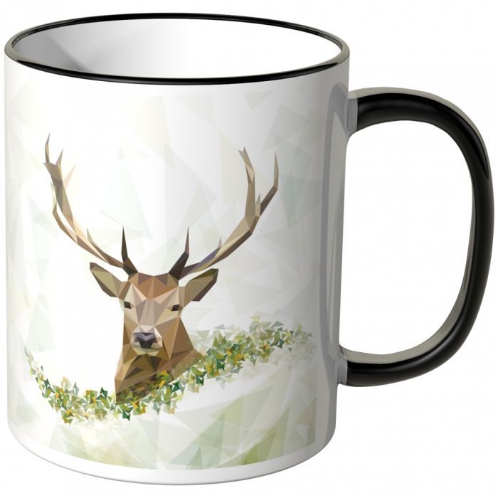 Diese Tasse wurde mit einem braunen Hirschkopf bedruckt, der aus vielen, geometrischen Formen besteht. Er ragt aus einer Ansammlung von grünen und gelben Dreiecken heraus.