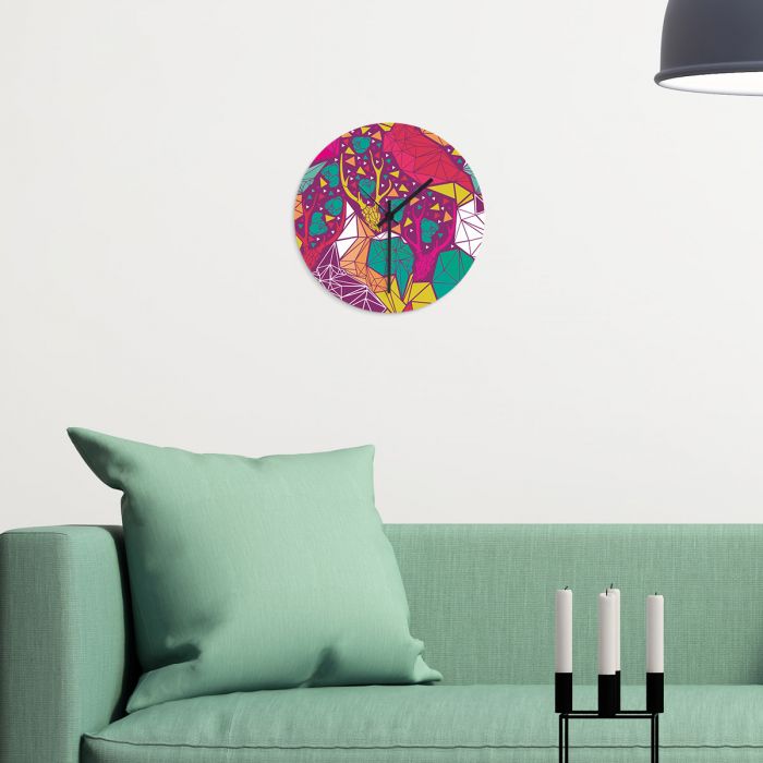 Die Wanduhr „Geometrical“ zeigt einen Mustermix aus Dreiecken, Rosen und Hirschköpfen. Farblich besteht die Uhr vor allem aus Lila- und Violetttönen und türkisen Akzenten. Aber auch gelb, pinke und orangene Farbfelder sind zu sehen. Ein echter Blickfang in jedem Zimmer!