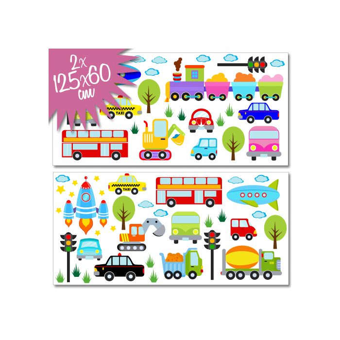 Brum brum - da kommt Stimmung ins Kinderzimmer - mit den bunten Wandsticker Autos. Ihr erhaltet auf zwei Bögen 64 Wandsticker rund um die bunte Autowelt. Mit den Baggern, LKWs, kleinen Autos, Zeppelinen, einer Rakete, Ampeln, Bäume und Gräser könnt Ihr eine tolle Autolandschaft auf die Wände des Kinderzimmers zaubern. Zieht die einzelnen Wandsticker einfach ab und positioniert sie an der Wand, genau so, wie Ihr möchtet.