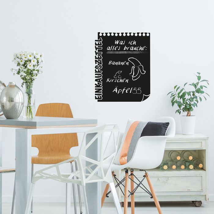 Wie oft passiert es, dass man in den Kühlschrank schaut, ein bestimmtes Lebensmittel haben möchte und es nicht da ist. Dann müsste man es eigentlich direkt auf den Einkaufszettel fürs Wochenende setzen. Mit dieser Tafelfolie geht das ganz schnell. Das Wandtattoo zeigt einen grafisch schönen Einkaufszettel und ist aus spezieller Tafelfolie hergestellt. So verschönert Ihr nicht nur Eure Küche, sondern könnt auch schnell fehlende Lebensmittel oder andere Produkte notieren. Natürlich eignet sich die Tafel auch für Notizen, kleine Grüße oder wichtige Termine.