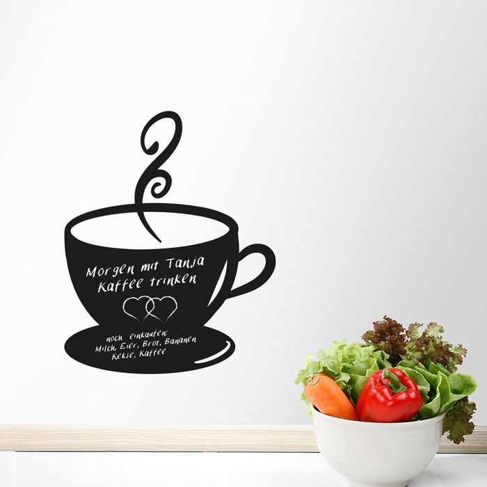 Für alle Kaffee-Trinker und vor allem Kaffee-Liebhaber ist dieses Wandtattoo aus Tafelfolie perfekt. Es zeigt eine Kaffeetasse mit schönem Schnörkel, das den Kaffee-Dampf dar stellt. Auf diese Kaffeetasse aus Tafelfolie lassen sich schnell mit Kreide wichtige Notizen, Grüße, To-Do-Listen und Termine notieren und ebenso schnell wieder wegwischen, um die Tafel neu zu beschreiben.