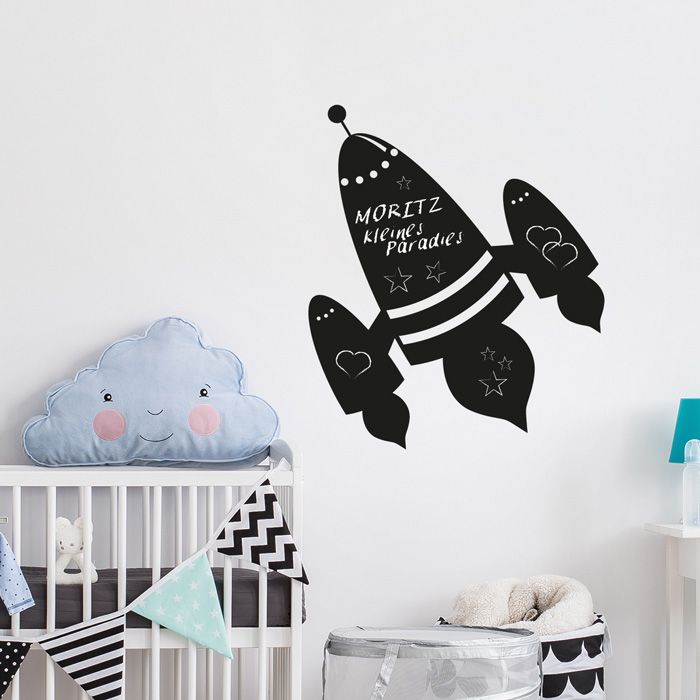 Auf diesem Wandtattoo aus Tafelfolie ist wirklich viel Platz für Notizen, Gedanken oder To-Do-Listen. Das Tafelfolien Wandtattoo zeigt eine Rakete, die perfekt in die Kinderzimmer passt, besonders in die, in denen kleine Raumfahrer Fans wohnen. Diese Rakete aus Tafelfolie könnt Ihr mit ganz gewöhnlicher Kreide beschreiben und ebenso schnell wieder sauber machen und neu beschriften. Die Folie klebt sowohl auf glatten Untergründen, als auch auf Raufasertapete.