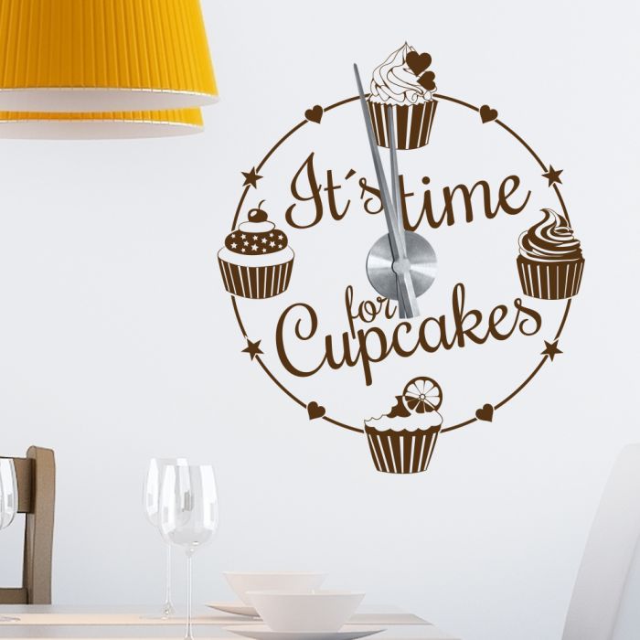 It´s time for Cupcakes und deswegen besticht diese Wandtattoo Uhr auch durch vier unterschiedlich gestaltete Cupcakes, die anstatt der Ziffern 12, 3, 6 und 9 gestaltet sind. Zwischen den vier Cupcakes sind kleine Sterne und Herzen gesetzt, die perfekt zu den Toppings der Cupcakes passen. Eine hübsche Wandtattoo Uhr für Deine Küche.