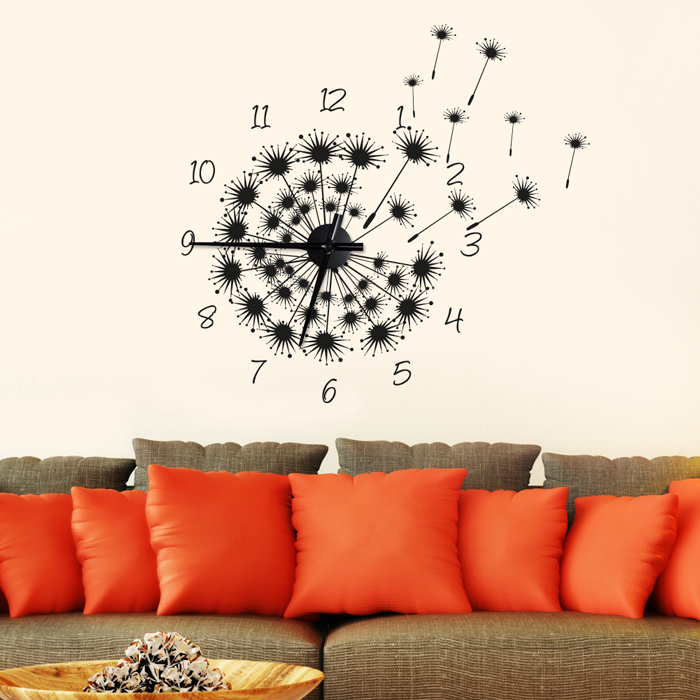 Die Wandtattoo Uhr zeigt eine Pusteblume und Samen, die über die Wand fliegen.