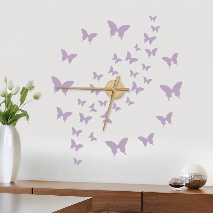 Diese Wandtattoo Uhr wird durch einen schönen Schmetterlingsschwarm gebildet. Es sieht so aus, als würden hinter dem Uhrwerk viele kleine Schmetterlinge herfliegen. Die Schmetterlings-Uhr wirkt stylisch und verspielt zugleich auf Deiner Wand.