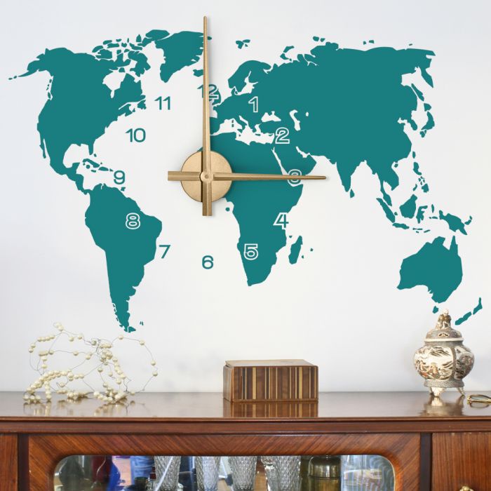 Diese Wandtattoo Uhr zeigt die Silhouette der Weltkarte, in die die Ziffern der Uhr eingearbeitet sind. Die Wandtattoo Uhr Weltkarte ist perfekt für alle Reisebegeisterten und Weltenbummler. Die Weltkarten Uhr sieht besonders schick über der Couch aus.