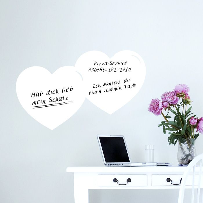 Dieses Wandtattoo ist aus spezieller Tafelfolie hergestellt und sieht somit nicht nur schön an Eurer Wand aus, sondern kann auch mit gewöhnlicher Kreide nach Lust und Laune beschrieben werden. Das Wandtattoo Tafelfolie zeigt zwei ineinander verschlungene Herzen, auf denen genügend Platz ist für die kleinen Liebesbotschaften und für Notizen, Termine oder andere wichtige Dinge wie z. B. die Nummer des Pizza Services.
