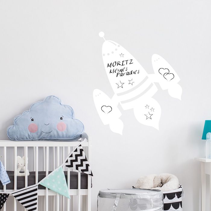 Auf diesem Whiteboard ist wirklich viel Platz für Notizen, Gedanken oder To-Do-Listen. Es zeigt eine Rakete, die perfekt in die Kinderzimmer passt, besonders in die, in denen kleine Raumfahrer-Fans wohnen. Diese Rakete aus Tafelfolie könnt Ihr mit Whiteboard-Markern beschreiben und immer wieder neu beschriften.
