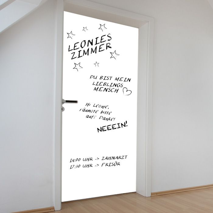 Mit diesem Whiteboard könnt Ihr ganze Türen bekleben. Die Folie ist 100 x 300 cm, passt also auf alle gängigen Türen. Und wo werden Notizen schneller gelesen, als direkt auf der Tür? Außerdem könnt Ihr natürlich die Folie zuschneiden und auf andere Untergründe, wie z.B. Schränke in der Küche oder einfach an die Wand kleben.