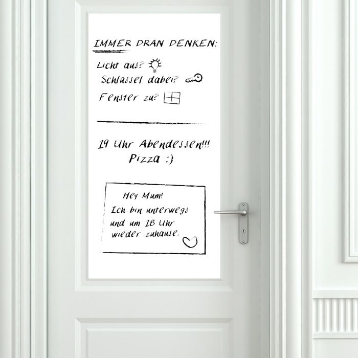 Hier könnt ihr Euer eigenes Whiteboard anbringen. Es ist 100 x 30 cm, eine optimale Größe für Notizen zwischendurch, z. B. in der Küche, über dem Schreibtisch oder an einem anderen Platz. Außerdem könnt Ihr die Folie zuschneiden und auf andere Untergründe, wie z. B. Schränke in der Küche oder einfach an die Wand kleben.