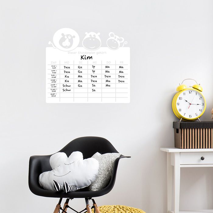 Mit diesem Whiteboard-Stundenplan könnt Ihr jedes Halbjahr aufs Neue den Stundenplan Eures Kindes eintragen. Auf dem Whiteboard könnt Ihr ganz einfach mit Whiteboard-Markern schreiben und immer wieder abwischen, wenn etwas geändert werden muss. Über diesen Stundenplan schauen drei "Safari-Tiere", ein Löwe, ein Nilpferd und ein Affe. So ist der Stundenplan nicht nur praktisch, sondern sieht auch noch toll aus.