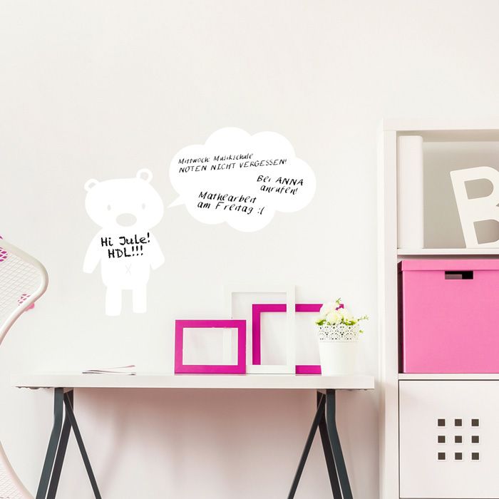 Dieses Whiteboard zeigt einen süßen Teddybären mit Sprechblase. Auf diesen beiden Tafeln könnt Ihr nach Lust und Laune mit Whiteboard-Markern immer wieder Notizen schreiben. Lustig ist es auch, wenn Ihr dem Teddybären einen Mund, Wimpern oder Augenbrauen malt - vielleicht genau so, wie Ihr Euch gerade fühlt.